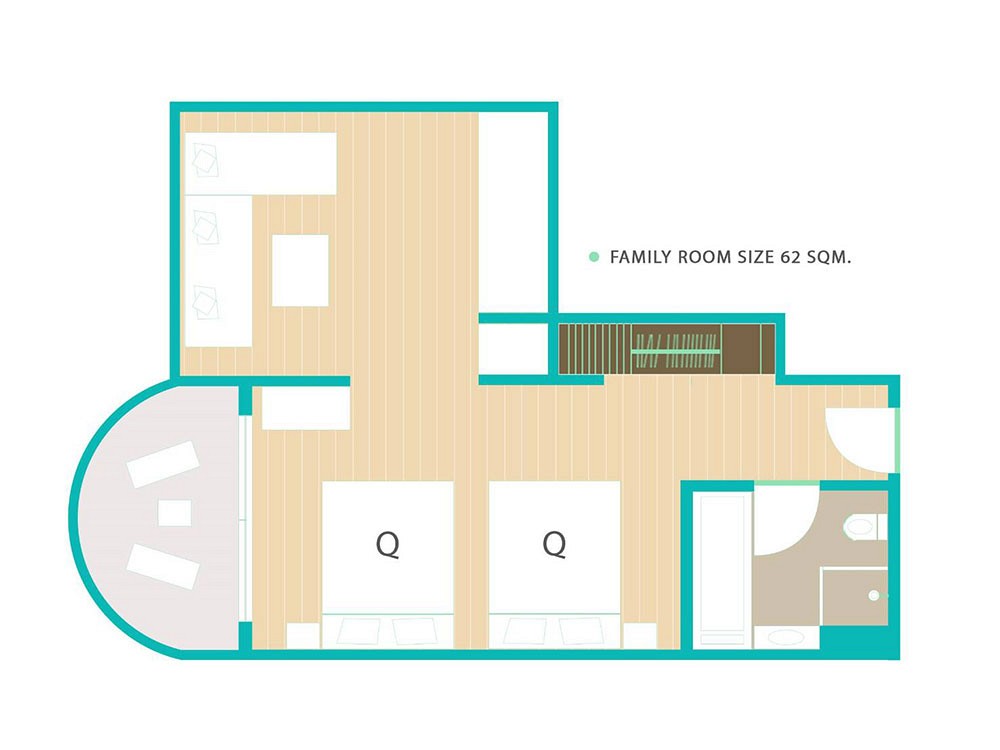 This spacious 62sqm room allows you to step from your private balcony to the refreshing swimming pool and features a comfy lounge area with an additional TV and pantry to unwind in style. Soothe away your cares in the Jacuzzi tub and relax with two queen size beds.
